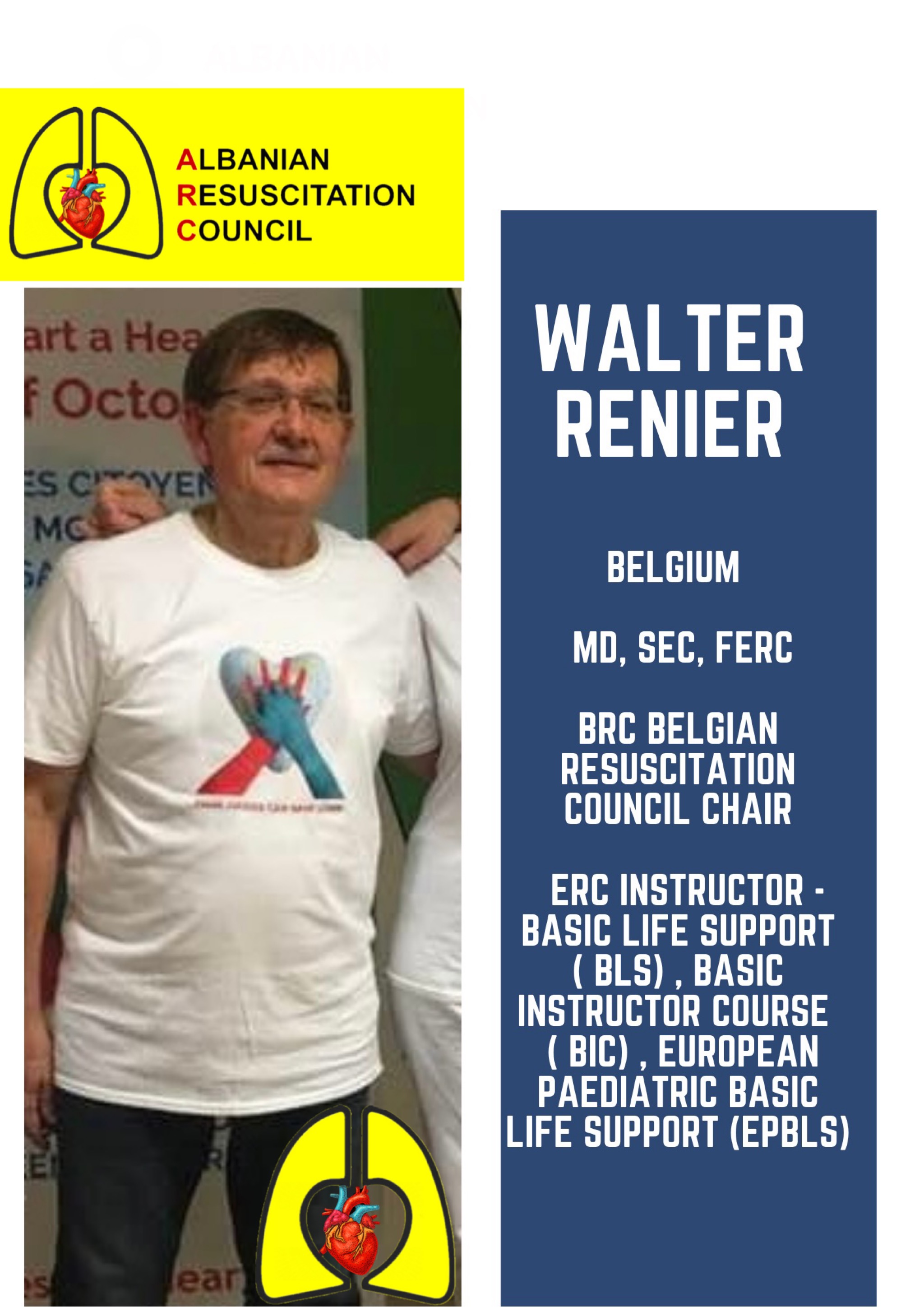 Dr Reiner eshte ekspert ne fushen e reanimimit per Supportin Baze per jeten BLS, si dhe EPBLS European Paediatric Life Support nga ERC European Resuscitation Council dhe njekohesisht dhe presidenti i BRC Belgian Resuscitation Council!